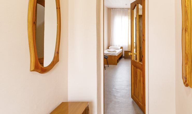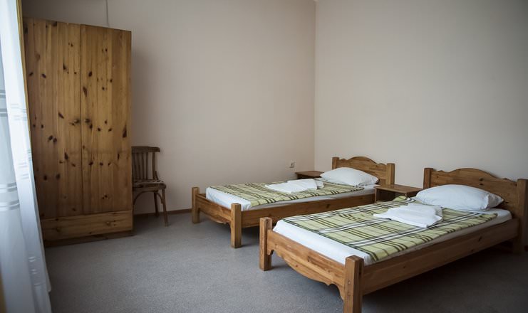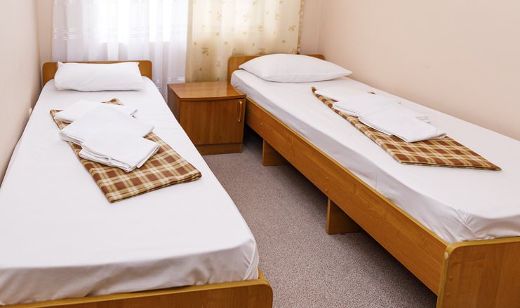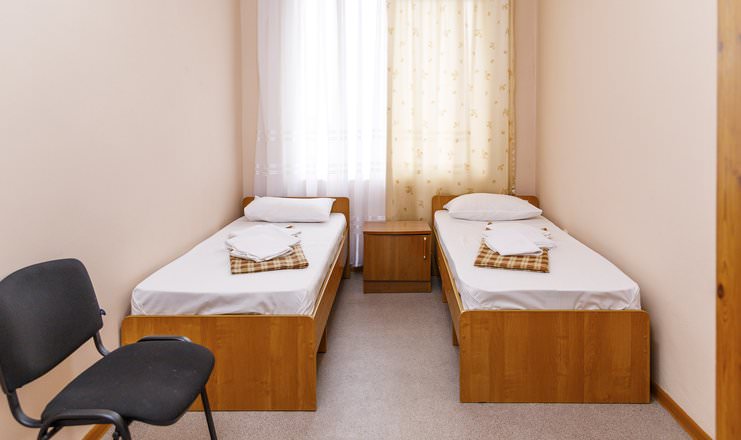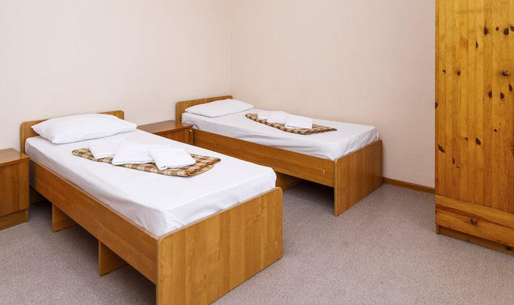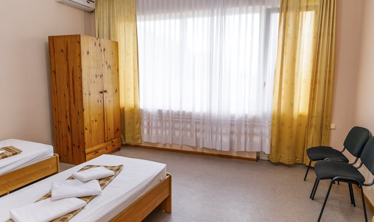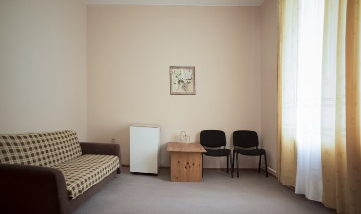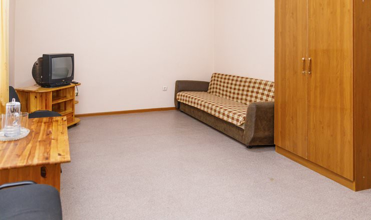 Для размещения предусмотрены односпальные или двуспальная кровать, а также раскладной диван. Номер оснащен холодильником, сплит-системой и ТВ.